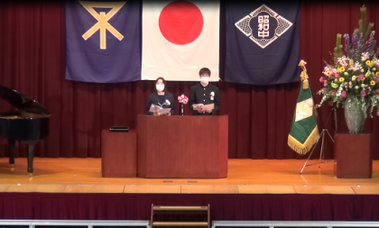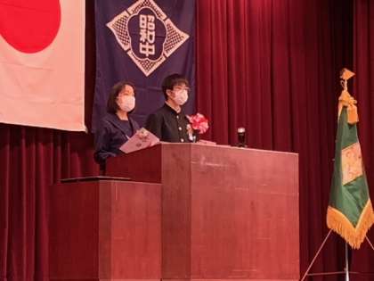 卒業生による答辞は、仲間と共に過ごした3年間の思い出の数々を一つ一つ振り返り、仲間の大切さや友情、絆の深まりについて語ってくれました。ここまで育てていただいた親への感謝、3年間導いていただいた先生方、そして温かく見守ってくださった地域の方への感謝の気持ちを述べました。最後にスティーブジョブズさんの言葉「Stay hungry, stay foolish」を引用し、同級生に対して「現状に満足をせず、常識にとらわれず、自分の信じた道を歩んでいきましょう」とメッセージを送りました。