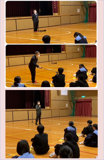 「皆さん、家に1人でいる状況を想像してください。そこに誰かが訪問してきたとします。誰が訪問してきたと思い浮かべますか。」と学級代表生徒一人一人にフィジカルディスタンスをとりながら聞きました。「友達」「宅配の人」など様々な返答がありました。「これは、深層心理で、誰を一番思っているかです。周りの人を大切にしてください。」