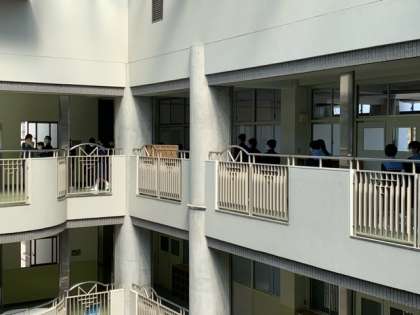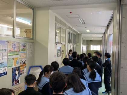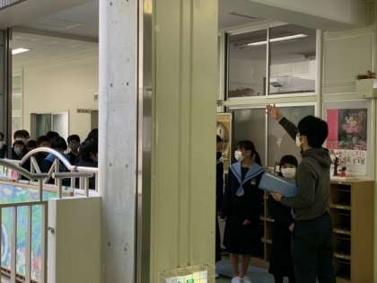 先生の引率のもと校舎内を見学しました。職員室への入り方なども教わりました。