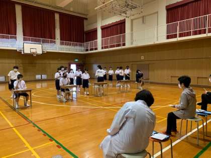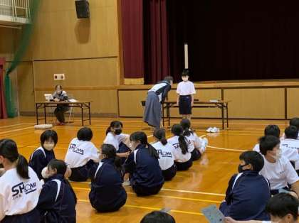 体育館で視力測定と身長・体重を測りました。先生の話をしっかり聞いて、静かに行動できていました。