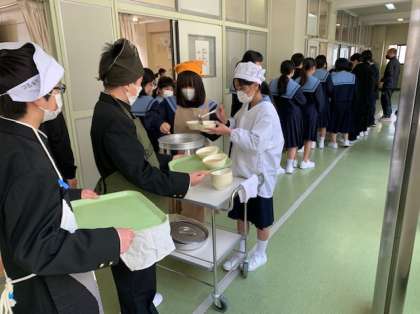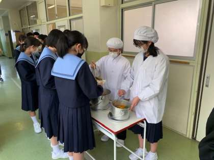 給食時間もみんな並んで静かに順番を待っていました。