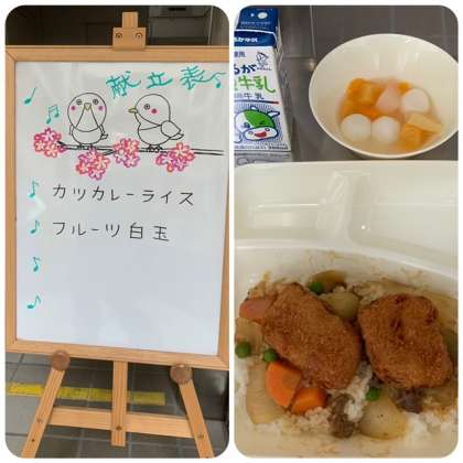 本日の献立は生徒が喜ぶカツカレーライスとフルーツ白玉でした。