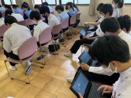 体育の授業で現在学んでいる集団行動の振返りとして、1人1台学習者用端末を用いて、班と個人の取組について各自で評価を行いました。