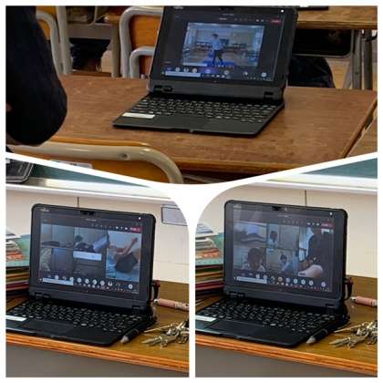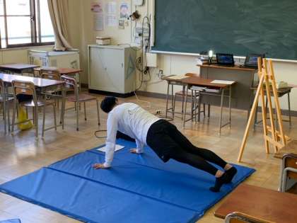 生徒は各々の自宅の部屋で、腕立て伏せの正しい仕方・ハンドボール投げのフォーム・V字腹筋・握力等を学習者用端末の画面を見ながら真似をしました。