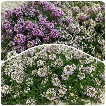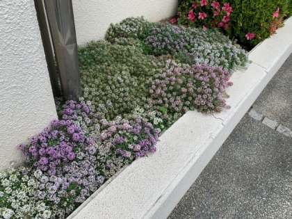 玄関に植わっているアリッサムがひろがっています。白・うす紫・赤紫の小さな花がこんもりと丸くなって咲いています。日々、元気アップボランティアさんとふれあい委員の生徒が水やりをしてくれています。美しい玄関の花々をありがとうございます。