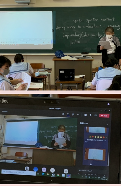 教室にいる生徒と一緒に先生の声を聴きながら、教科書に目を通したり、問題を考えたり、作業を行ったりしています。写真上は3年生英語、写真下は3年生家庭科です。