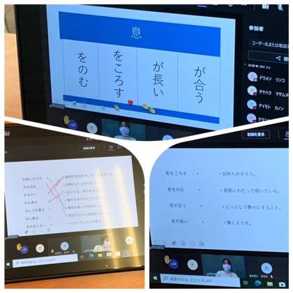 教材「竜」に出てくる「慣用句」について学習しました。先生が用意した画像を見て、分かった人は手のマークを押して手を挙げました。先生が当てると元気な声で答えてました。