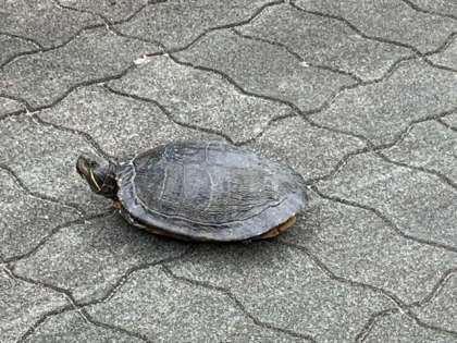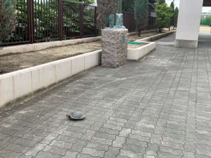 朝一番に体育館前のスライド門を開けると、驚いたことにそこには体長20cmほどの亀がいました。