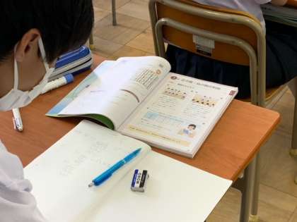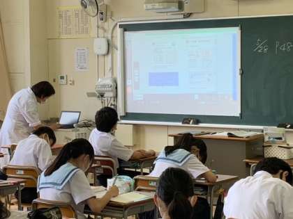デジタル教科書をプロジェクターで映し出しながら、具体的な場面で正の数・負の数を用いて表したり処理することを学びました。前に映し出されたデジタル教科書と手元の教科書を見比べられるので理解がしやすそうです。