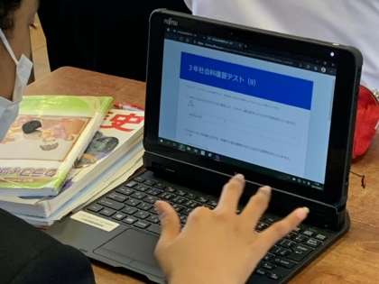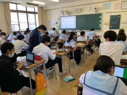 歴史分野の近代史を学習しています。学習者用端末を使って、小テストも実施しました。先生がMicrosoft Formsで作成したオリジナル小テストに、生徒は入力をしていきます。解答を送信すると、すぐに正解と得点が表示され間違い点もすぐにわかります。個人の解答データーが蓄積されていて、生徒の振り返りや先生の方でも生徒の理解度が即座にわかります。とても効果的な学習方法です。