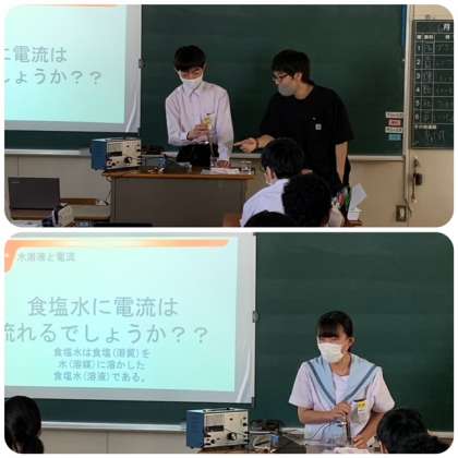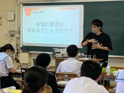 電流計を教室に持っていき、食塩水に電流が流れるかどうかの実験をしました。食塩の結晶では、電流は流れませんでしたが、食塩を水に溶かしてしまうと電流が流れ豆電球が光りました。体験の積み重ねが学習定着につながります。