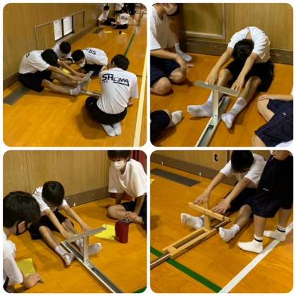 長座体前屈、握力、腹筋などをグループやペアを組んで、声をかけたり励まし合いながら測定しました。