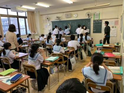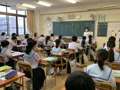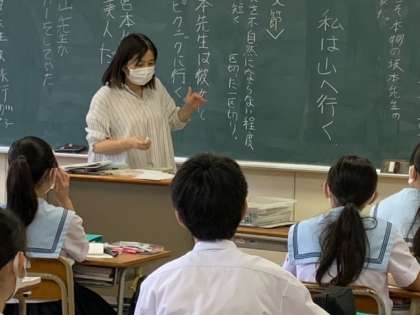 単語、文節などのことばの単位について学びました。黒板の前に出てきた生徒がオリジナル短文を発表し、先生が文節に区切りながら理解を深めていきました。面白い短文も紹介されていました。