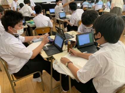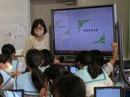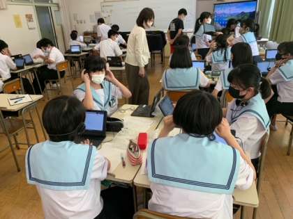 身のまわりから聞こえてくるいろいろな音を聞いて、その情景をイメージしました。生徒はヘッドセットをつけて、3〜4人班に分かれ、全員が与えられた役割の中でイメージした情景から短い話をつくりタイトルを決めていきました。最後に班ごとにタブレットにスピーカーを繋いで発表をしました。
