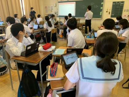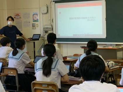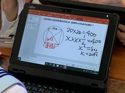 パワーポイントを使って丸太から角材を切り取ろうとしている写真を見せ、できるだけ無駄がないように断面が正方形の角材を切り取る方法を考えました。直径20cmの丸太からとれる角材(正方形)の1辺やその反対に1辺が20cmの正方形を切り取る時の丸太の直径はというように具体的な数値を与えて、グループに分かれて各自の考えを共有し発表しました。