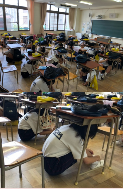 非常ベルの合図とともに、地震発生の緊急放送が入り、生徒は一斉に机の下に隠れました。