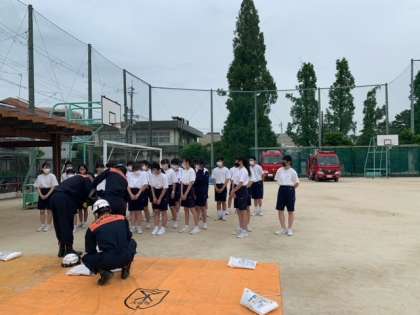 3つの班に分かれて、担架作成・搬送訓練、水消火器、応急処置の3つに分かれて、それぞれ消防署の方から指導していただきました。