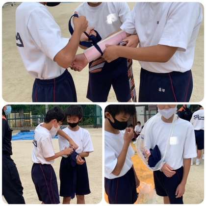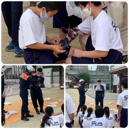 消防署の方から骨折や怪我をした場合の緊急対応の仕方を教えていただきました。雑誌やビニル袋が非常時に利用できることを学びました。