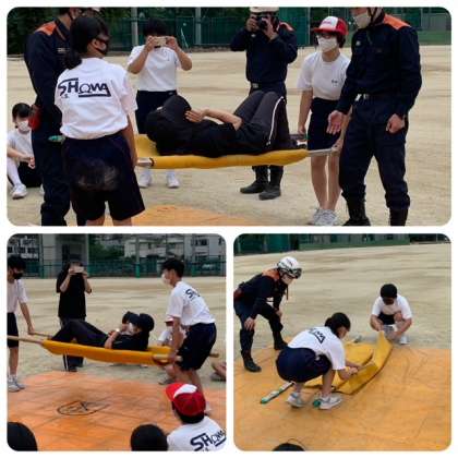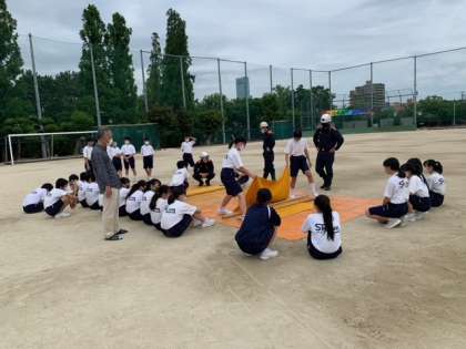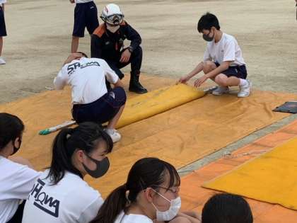 2本の棒と布を使って、簡易担架の作り方を学びました。2人ペアになり息を合わせながら簡易担架をつくりました。先生が横になり生徒が持ち上げました。持ち上げ方、降ろし方も学びました。