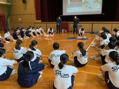 消防署の方の指導により、AEDの使い方と心臓マッサージのトレーニングを2〜3人ずつのグループに分かれて行いました。