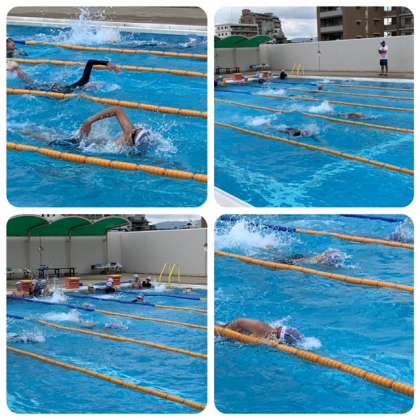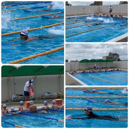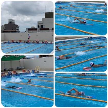 クロールの形を練習するため、初めにバタ足練習、そして顔を横に向けての呼吸練習、ストロークを付けての呼吸練習から、最後はビート板なしでのクロールを泳ぎました。