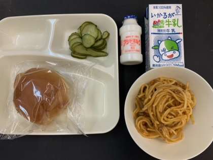 メニュー:スパゲッティミートソース、きゅうりのピクルス、発酵乳、1/2パン、牛乳