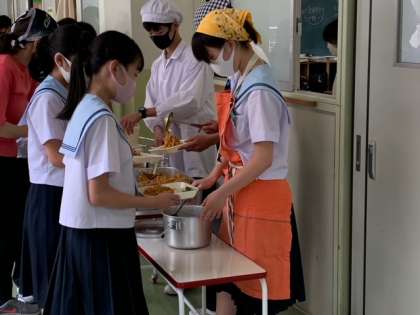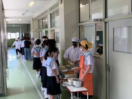 1列に規律正しく並んでいる生徒に、給食当番は手際よく配膳しています。