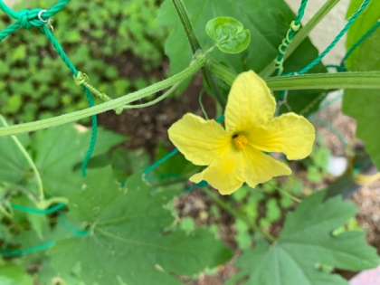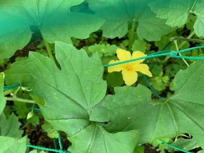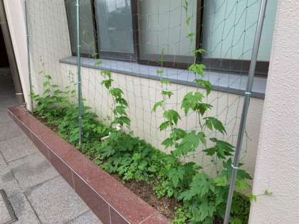 5月28日にふれあい委員の生徒が植えたゴーヤが1m程の高さまですくすくと成長しています。花もちらほらと咲き始めています。朝はふれあい委員生徒が水やりをしています。