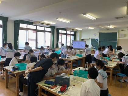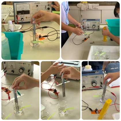 薄い塩酸やアンモニア水などの酸・アルカリ性水溶液に電圧をかけて、電流が流れるかどうかの実験をしました。7種類の水溶液に電極棒を差し込み豆電球の点灯で確認しました。実験体験を通して学習したことは忘れにくいものです。