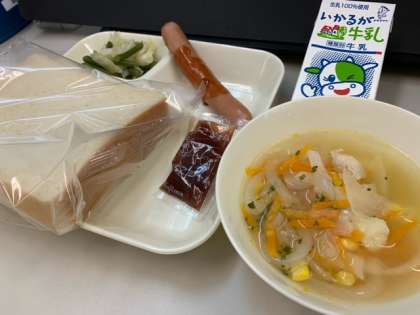 ウインナーソーセージにケチャップソースがかかっていました。スープには鶏肉・にんじん・たまねぎ・じゃがいも・コーン・パセリが入っていました。