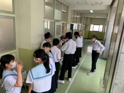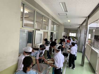 順序良く並んで、給食当番さんからの配膳を待っています。
