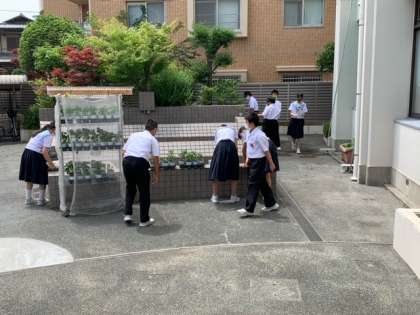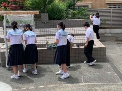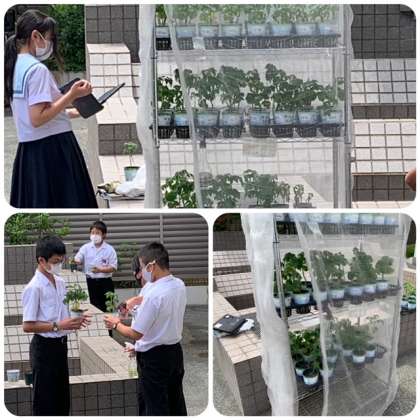 昼休み時間に、スプレーで土を湿らせ、日々の成長を学習者用端末のカメラで撮り、記録をしています。自分のトマトの成長を楽しみに、大切に育てています。