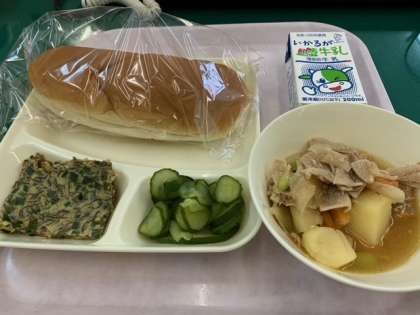 メニュー:もずく入りヒラヤーチー、 豚肉とあつあげの煮物、 あっさりきゅうり、 パン、 牛乳