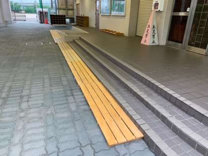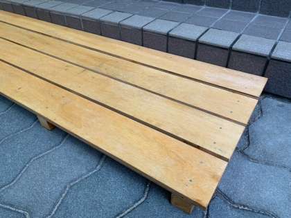 体育館前にある「木製すのこ」が古くなり、黒くなっていましたが、管理作業員さんが新しい木板を組み合わせて「木製すのこ」を作ってくれました。ワックスも塗っていただきピッカピカになりました。