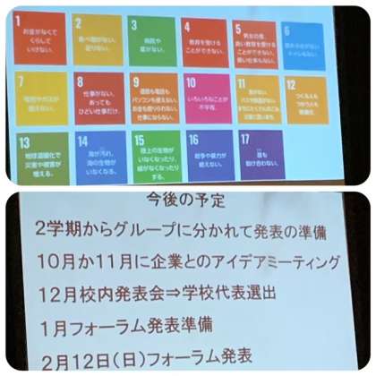 先日、SDGsの17の目標から生徒一人一人が、自身の関心のあるものを選びました。これからクラスの枠を超えて同じ目標を選んだ者同士集まって調べ学習をしていきます。今後、企業の方からアドバイスをいただきながら発表にこぎつけていきます。