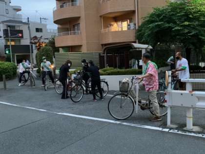 PTA、地域防犯関係諸団体、教員と総勢35人くらいで夜間巡視を行いました。二手に分かれて、自転車で校区内を走りました。