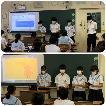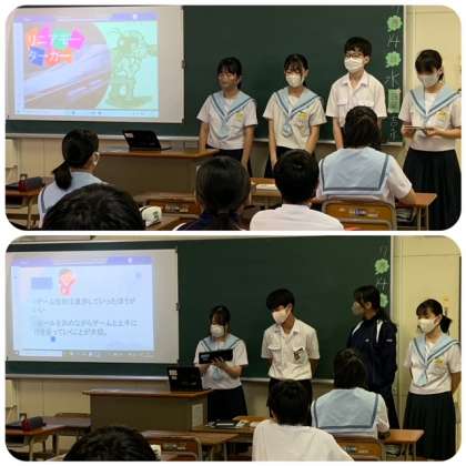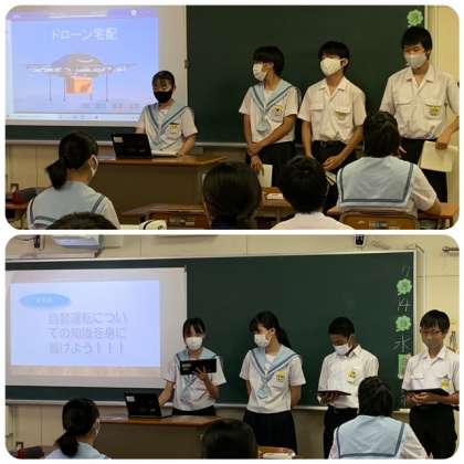 7つの班に分かれて、科学技術の進歩「自動運転車の普及」「リニアモーターカーの開発」「スマホなどの普及と技術の進歩」「ゲーム技術の進歩」「原子力発電での電力の供給」「ドローンで荷物を運ぶ」「AIや人工知能の進歩」によるメリット・デメリットを調べました。その調べたことをパワーポイントを駆使して、聞き手にわかりやすく説明をしました。どの発表も、聞いていて勉強になるくらい良く調べられていました。