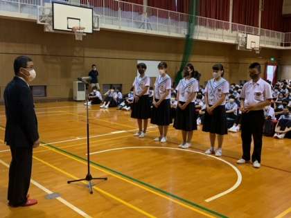 「コロナ対策としてのマスクの着用を2学期も引き続きしてください。交通安全には気をつけて事故の無いように過ごしてください。声かけ事案があれば学校に連絡してください。」