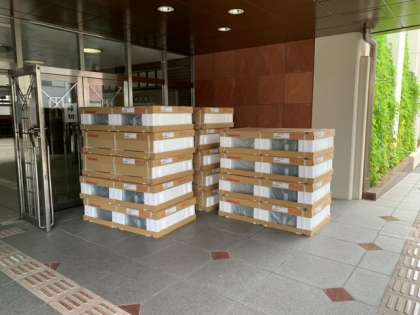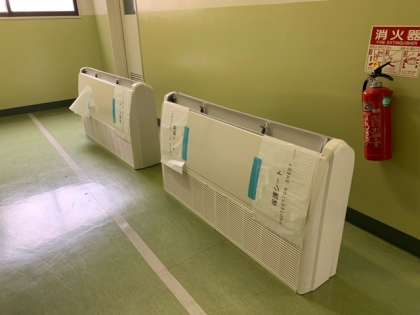 各特別教室の前まで運ばれました。いよいよ新エアコンの取り付け作業が始まります。