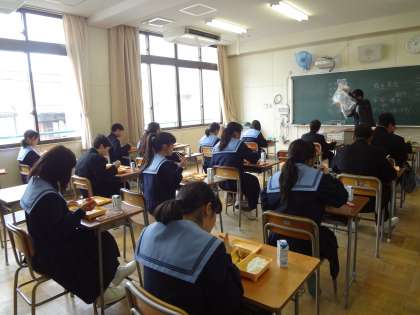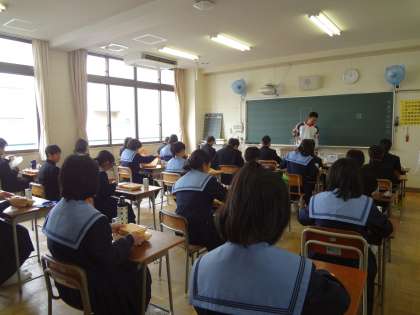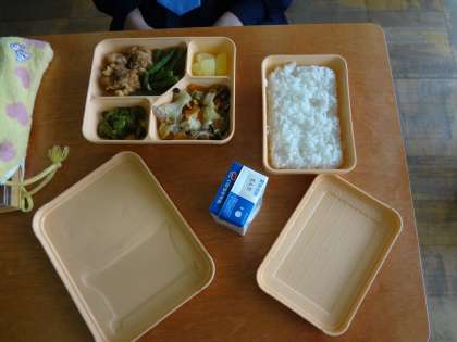 本日から給食が始まりました。今日のメニューは、「鶏肉の竜田揚げ、三度豆のおひたし、豚肉と野菜の炒めもの、きゅうりのおかかあえ、りんご缶詰」です。1年生に感想を聞いてみると「ご飯がおいしい」「思ったよりおいしい」との感想が。しっかり食べて力をつけましょう。後片付けの仕方も、担任の先生から説明がありました。