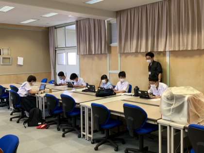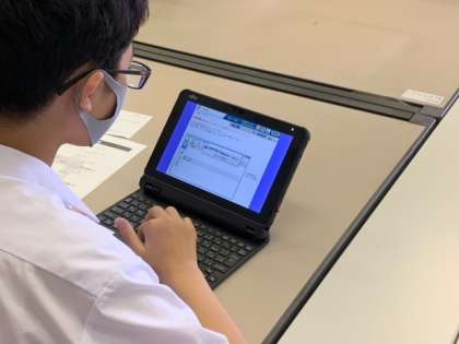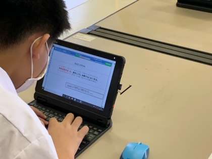 パソコン教室に合ったデスクトップタイプのパソコンも、一人一台学習者用端末の導入に伴い引き上げられました。そのためコンピュータ部の活動時は、各自が教室に保管している学習者用端末をパソコン教室に持って来て使用しています。