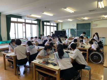「化学変化と電池」の章で、電池のしくみを学びました。班ごとに分かれて先生の指導を仰ぎながら金属のイオンへのなりやすさを確認しながら電圧計を用いて確認しました。