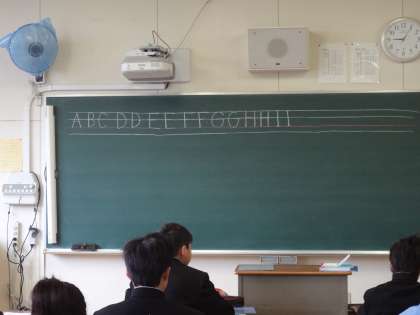 1年生の授業の様子です。英語の授業でアルファベットの書き順を学んでいます。
