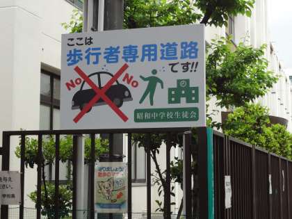 このたび、生徒会役員が中心になり車両が通行出来ないことを呼びかける看板のデザインを考え、PTAにご協力いただいて看板を設置していただきました。阪和線高架下の校舎角と住宅側の校舎角の2か所につけていただきました。ありがとうございます。