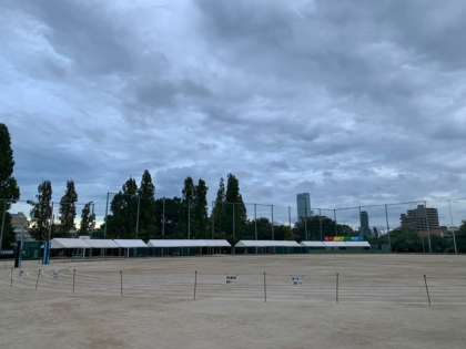 朝の運動場の様子です。全体的に雲に覆われていますが、西の空は明るくなってきています。