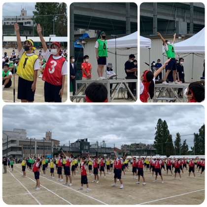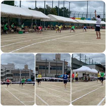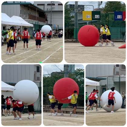 100m走では各自が全力疾走、大玉運びは協力して行いました。