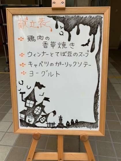配膳員さんが給食メニューボードを10月バージョンに書き換えてくださいました。ハロウィンを題材として、その雰囲気が素晴らしく上手に描かれています。