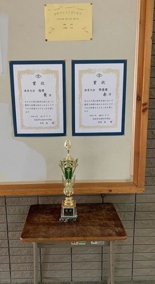 体育大会で優勝・準優勝した団の賞状とトロフィーを、通用門側入り口に掲示・設置しました。