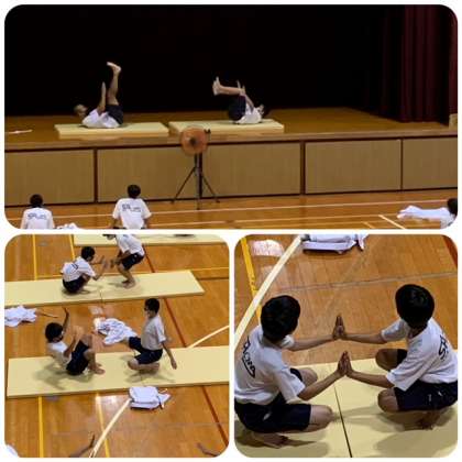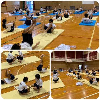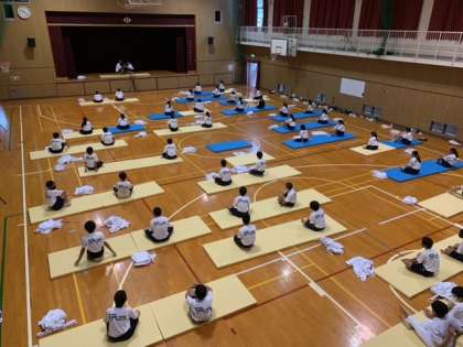 男女一緒に柔道の受け身を学んでいます。蹲踞(そんきょ)の姿勢から、ペアで手のひらを押して、後方に転がったところで手を畳につき、受け身の姿勢をとる練習をしています。顎を引いて、頭を打たないように注意しています。