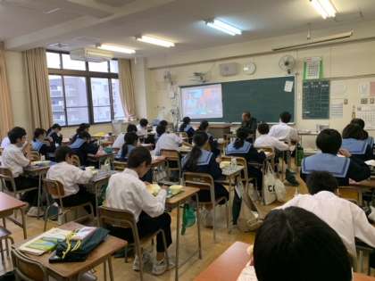 生徒の黙食を維持するため、動画を見せながらの喫食を工夫しています。